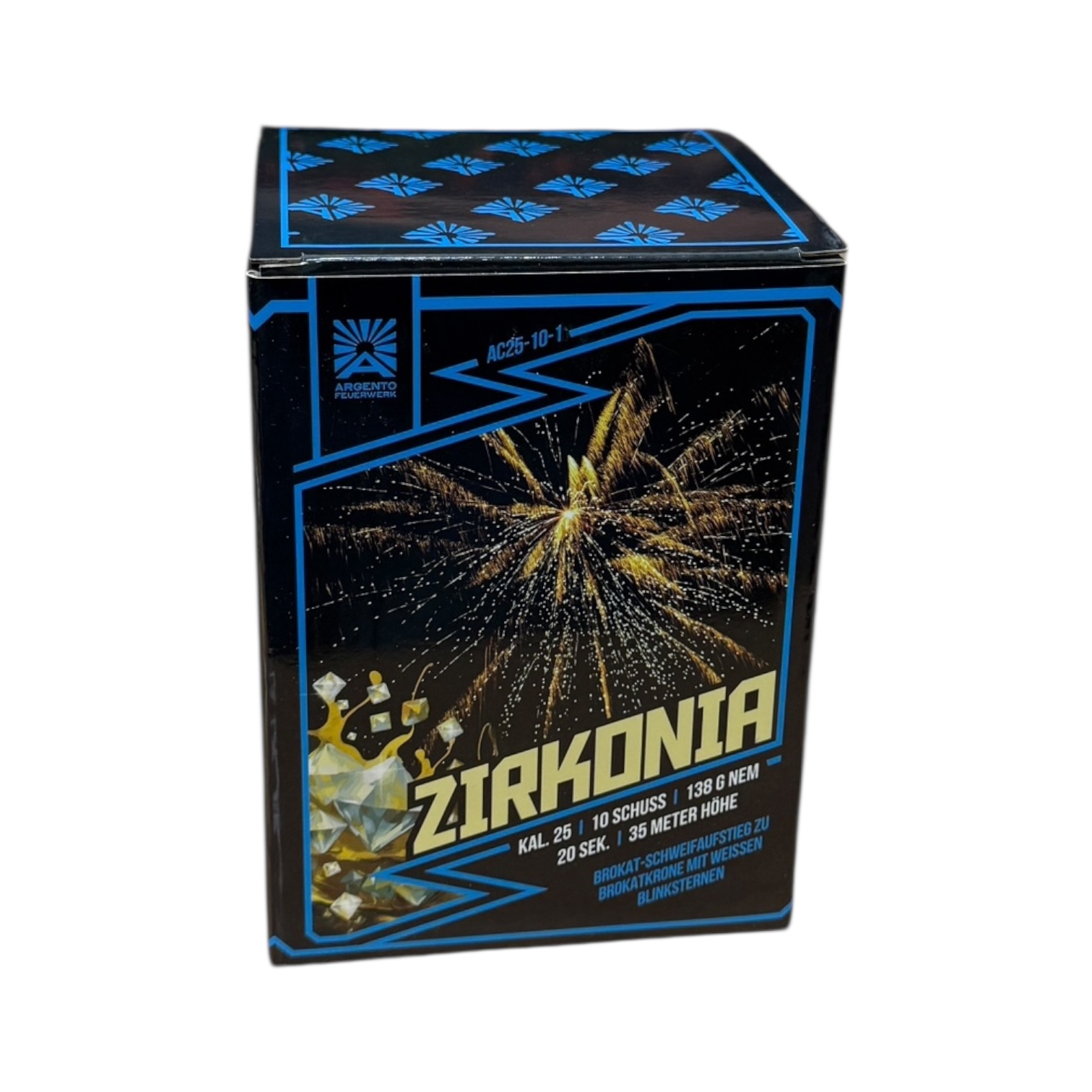 The Zirkonia AC25-10-1 from Argento Fireworks is a finely-engineered 10-shot aerial battery in 25 mm calibre, offering a runtime of approximately 20 seconds and a net explosive content (NEC) of around 138 g.