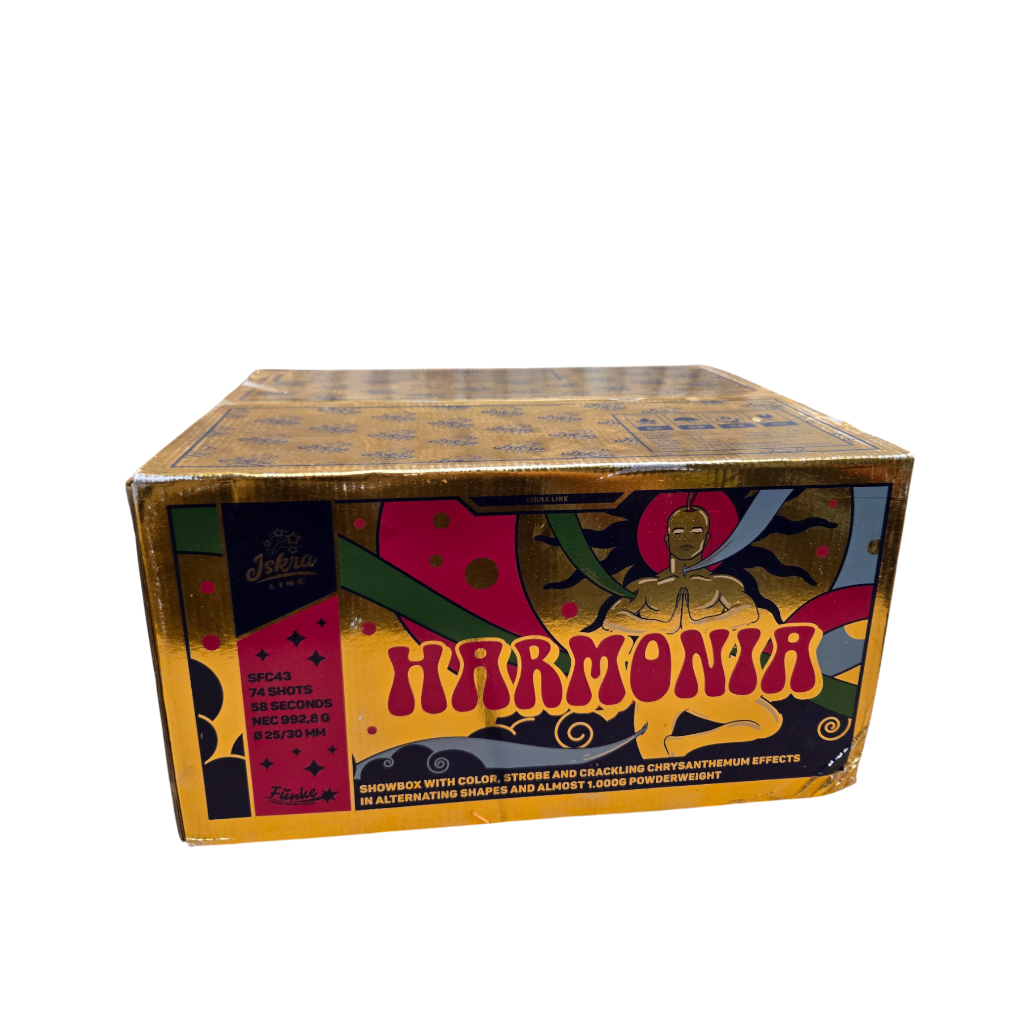 The HARMONIA — SFC43 is a 74-shot, 30 mm multi-effect firework cake designed for display-grade performance in professional and high-end retail fireworks shows. Engineered to deliver strong aerial breaks, bright color effects, and sequenced firing, the SFC43 provides a balanced show element perfect for mid-program highlights or finale cues.