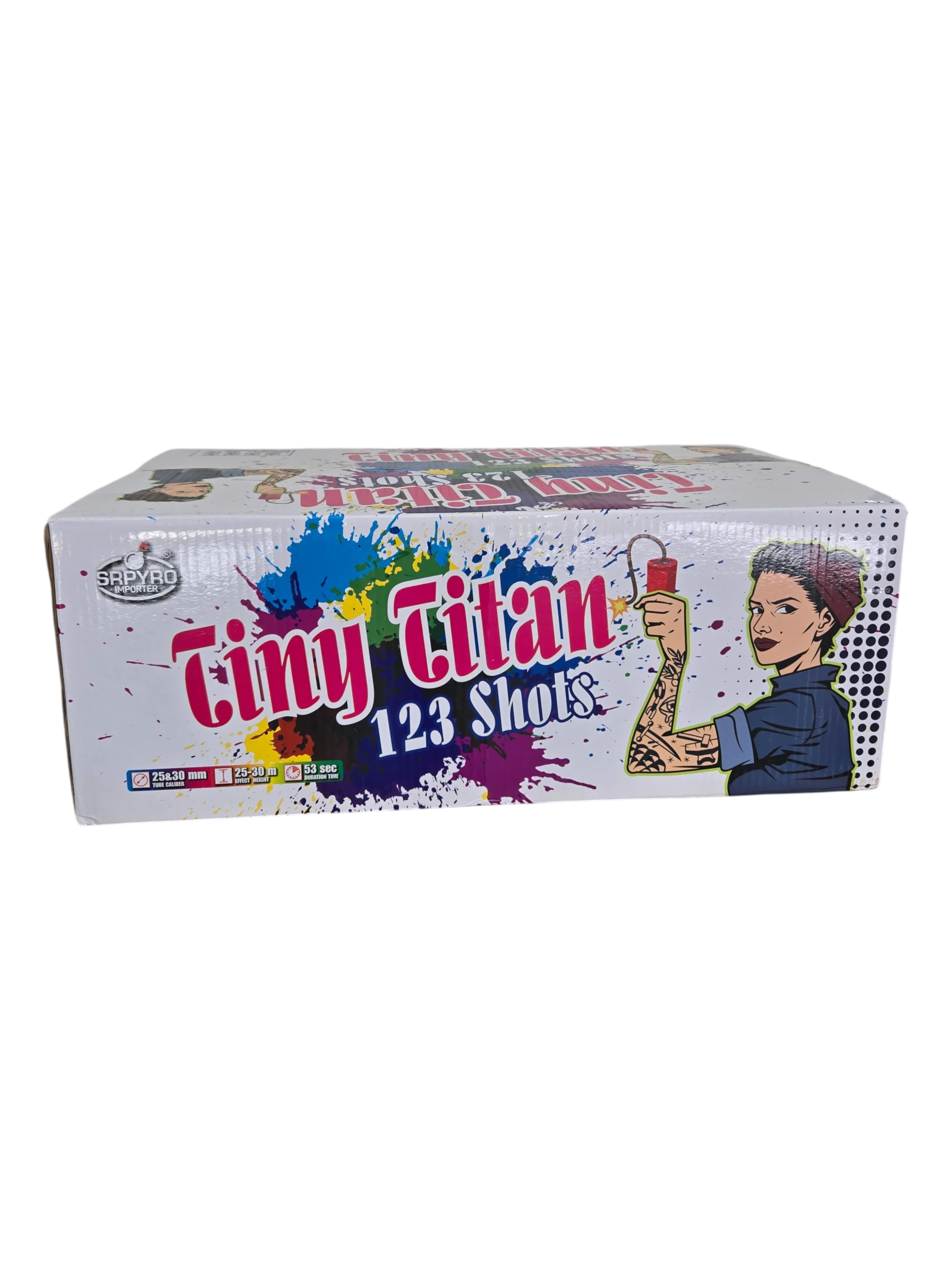 - Brace for Tiny Titan—a 123-shot dynamo packing nearly 2 kg of explosive content. Over the course of about 55 seconds, it unleashes relentless visual energy, with each cascading burst promising momentum, depth, and theater in one compact package.