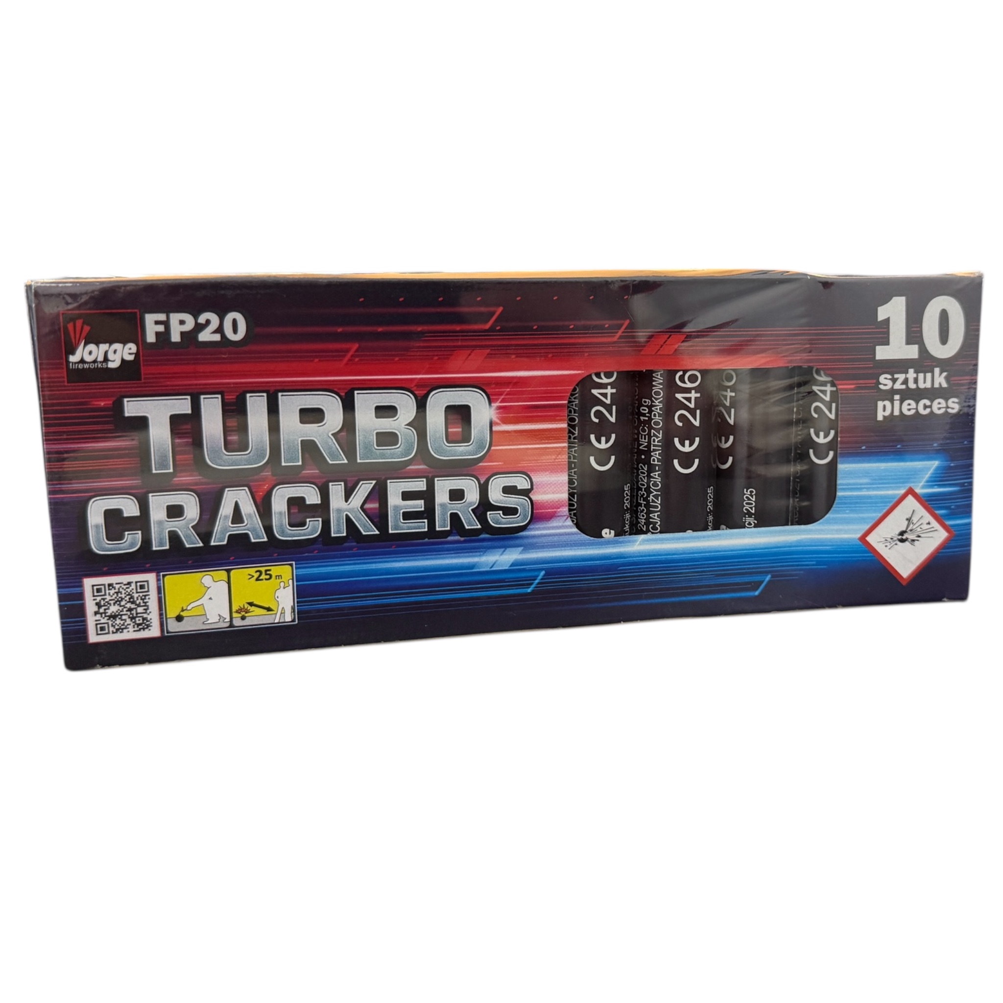 The FP20 — Turbo Crackers from Jorge Fireworks are a set of high-power flash firecrackers designed for maximum sound impact and reliable ignition. Each cracker produces a sharp, loud report with an intense flash effect, delivering the classic cracker experience with modern safety compliance.