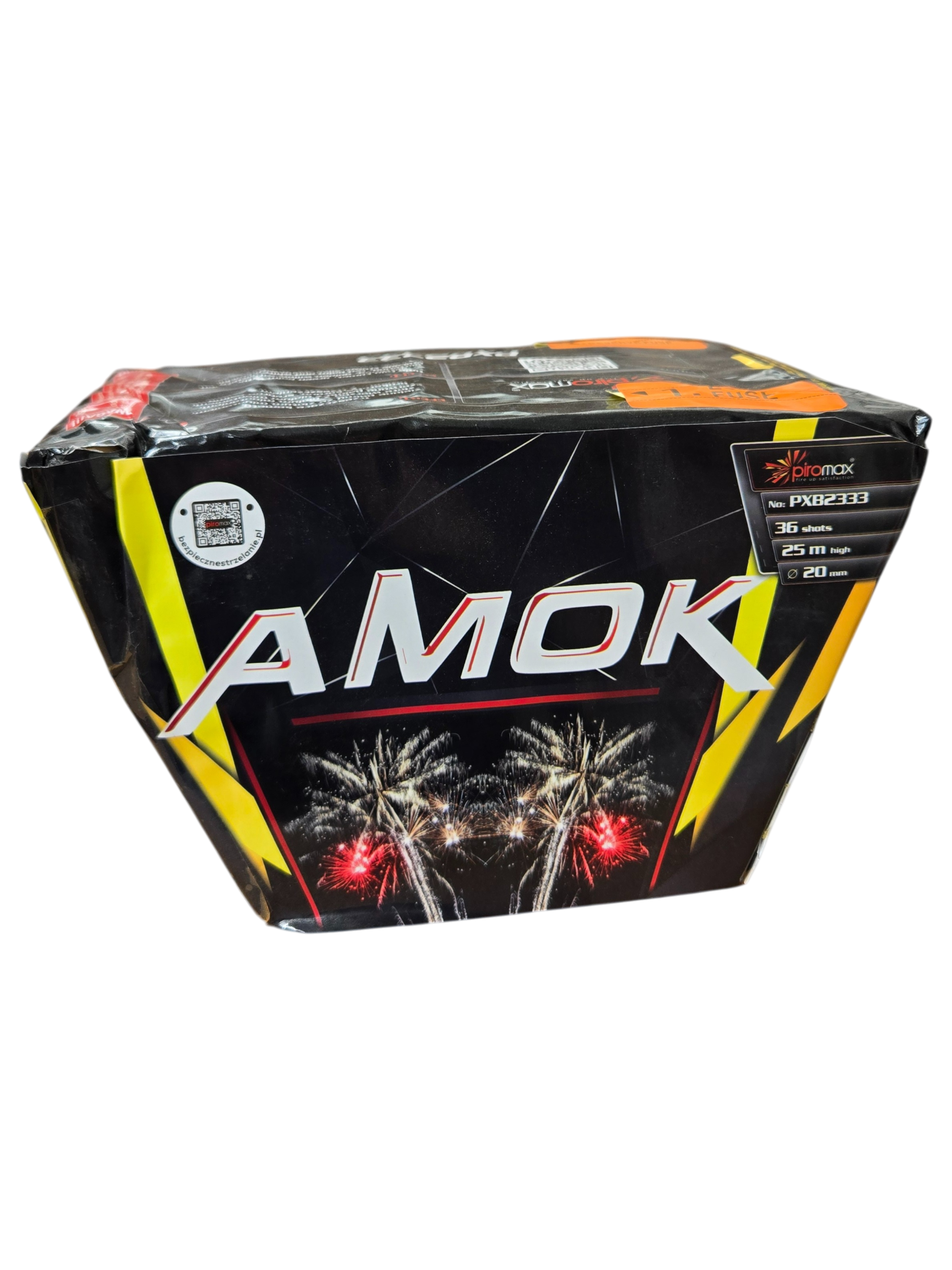 A Amok PXB2333 da Piromax é uma impressionante bateria de 36 disparos em forma de leque com calibre 20 mm, concebida para pintar uma ampla faixa de efeitos no céu. Funciona durante cerca de 20 segundos e produz rajadas até cerca de 25 metros de altura. Classificada na categoria